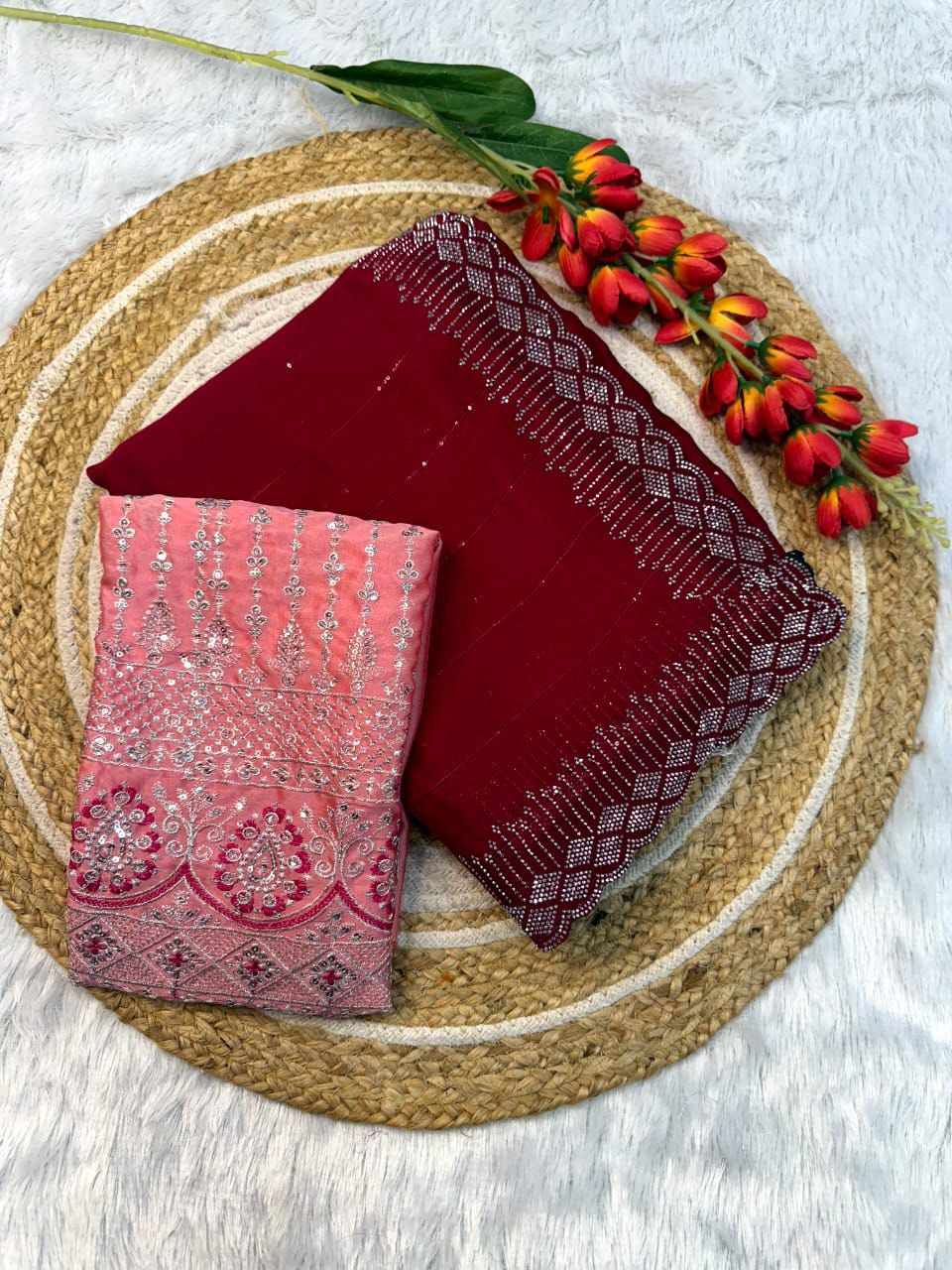 RC chiffon sequins red beautiful saree