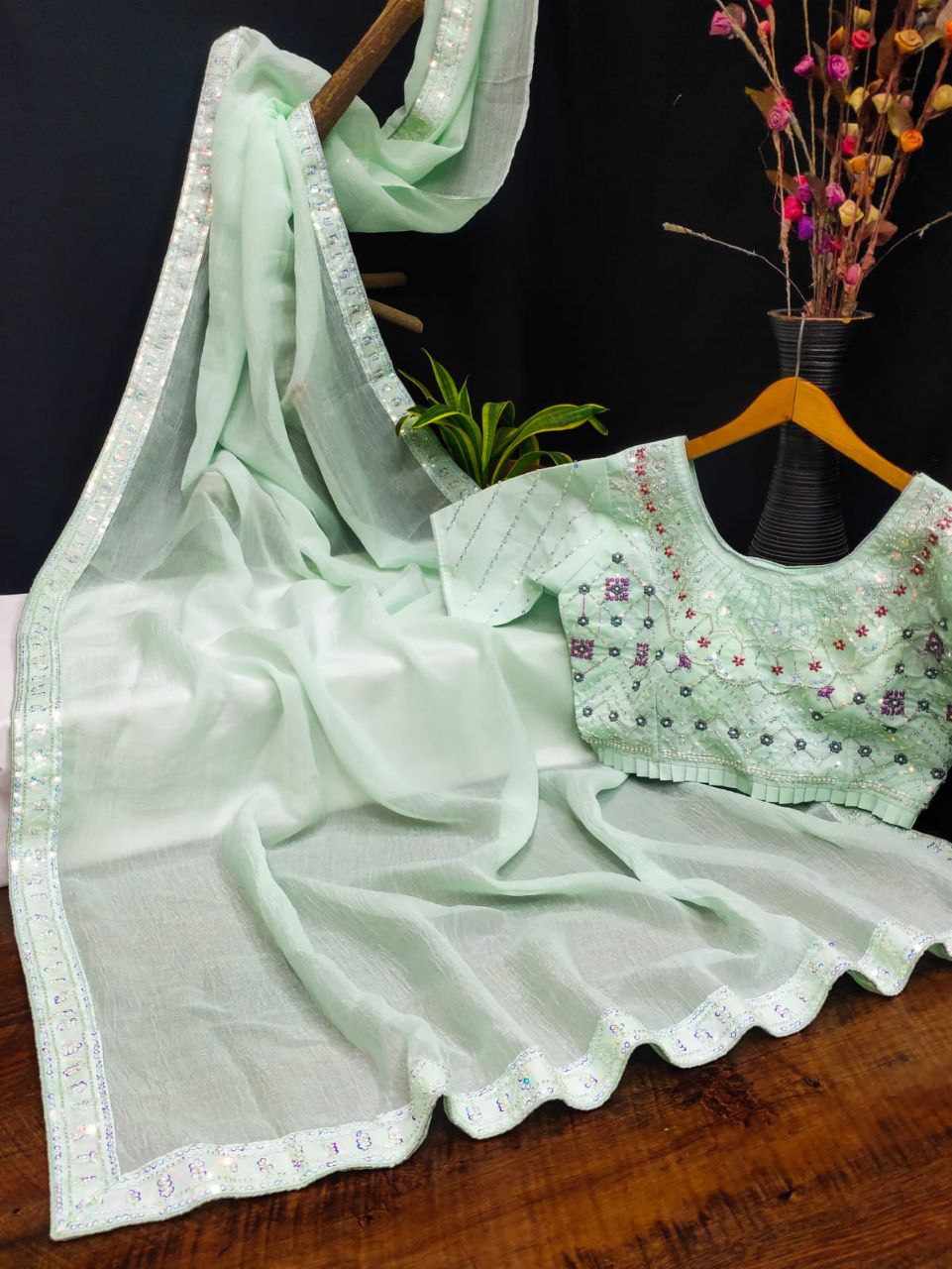 Saree Fabric: Beautiful crush shining saree with beautiful heavy handwork with beautiful rainbow sequins attached VALMOTI lace on the saree.